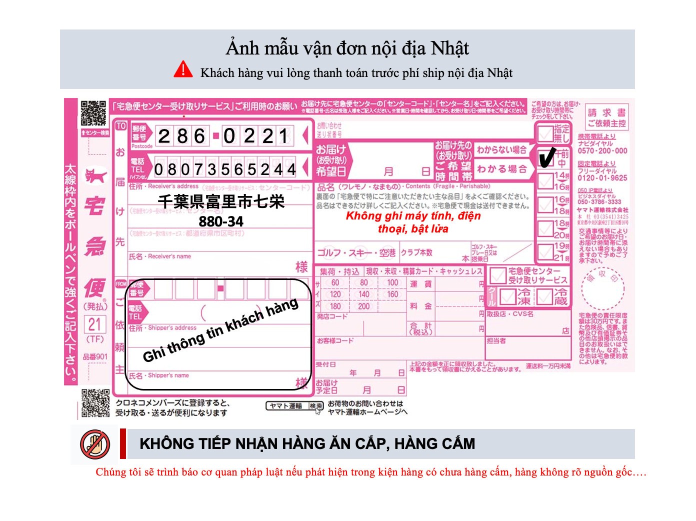 Lưu ý Giờ nhận hàng: buổi sáng ( 午前中)